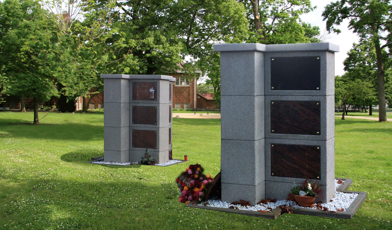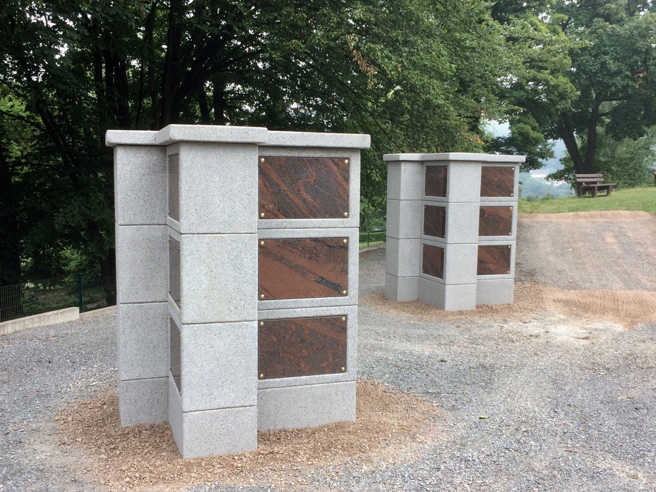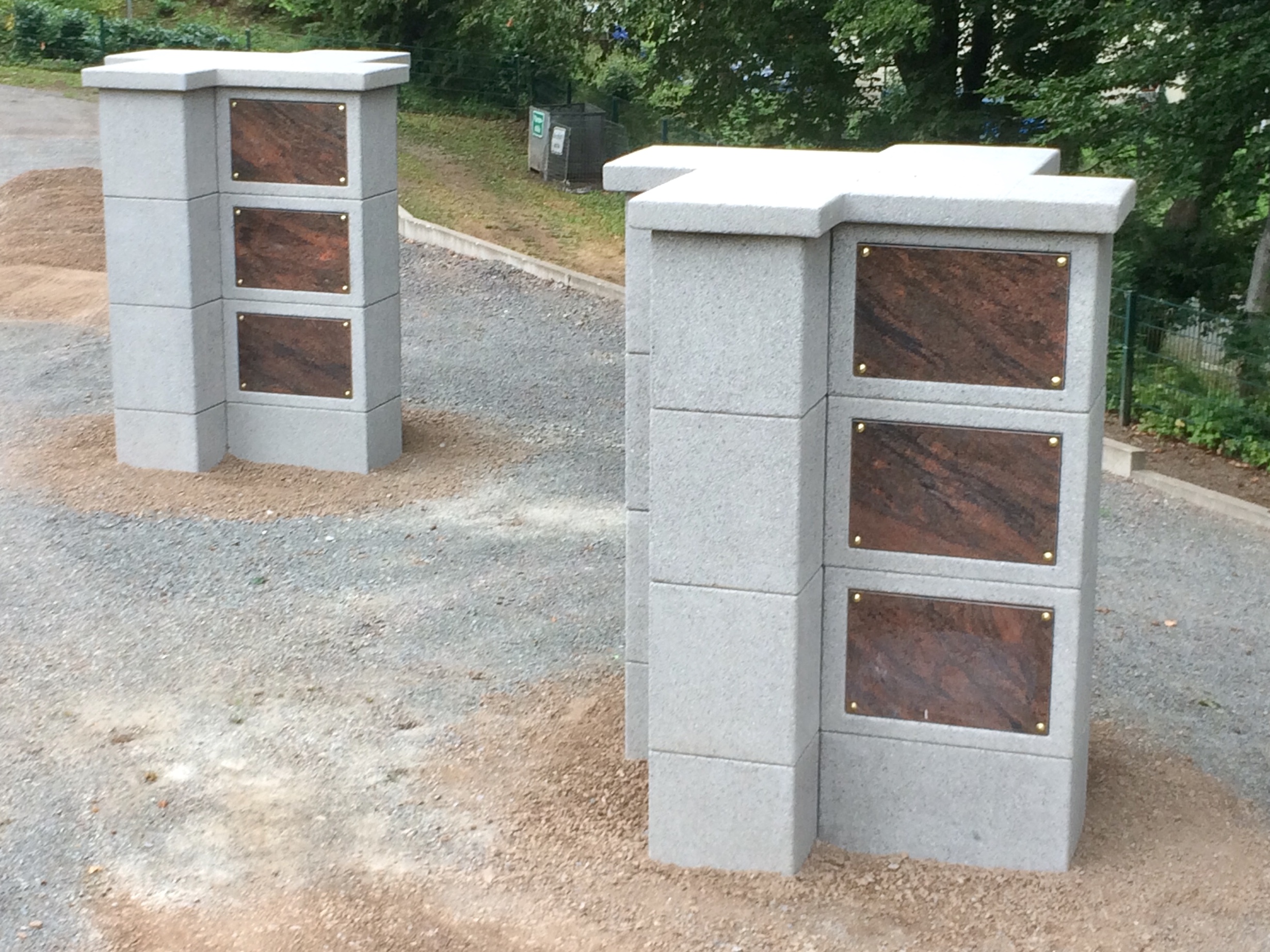 Die neu konzipierte Kreuzstele wurde nach den Wünschen eines Kunden entwickelt. Ziel war es eine Formation zu finden, die es ermöglicht, bei einer 4seitigen Belegung des Kolumbariums auf kleinem Raum genug Privatsphäre für den einzelnen Besucher zu bieten. Jeder Angehörige möchte im Moment der Trauer nicht gestört werden und die Verletzlichkeit des Moments nicht mit jemand Fremden teilen. Daher bietet diese 4seitig zu belegende Kreuzstele durch die Positionierung der jeweilig angrenzenden Rückwand einen Rückzugsort zur Trauer. Durch die Fertigung der Urnenstele als einzelne Bauelemente kann die Urnenstele auch auf kleinen Friedhofswegen mit dem Friedhofbagger zum Montageort gefahren werden. Eine bauseits erstelle frostfreie Fundamentplatte bietet genügend Festigkeit für die Urnenstele.