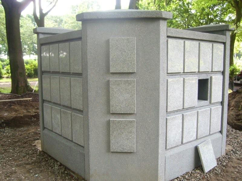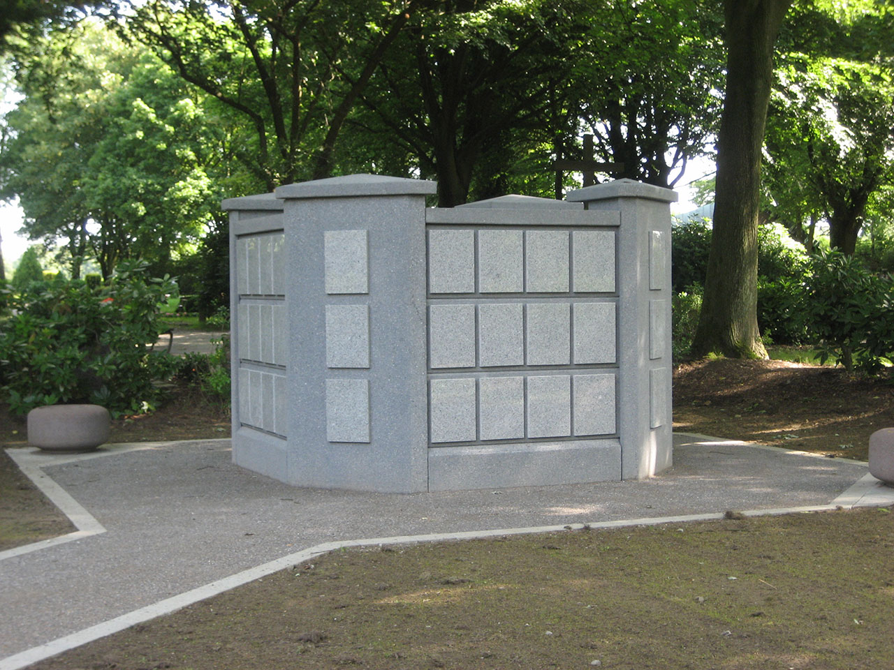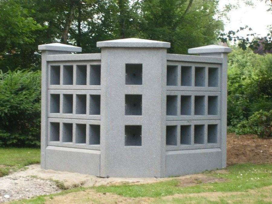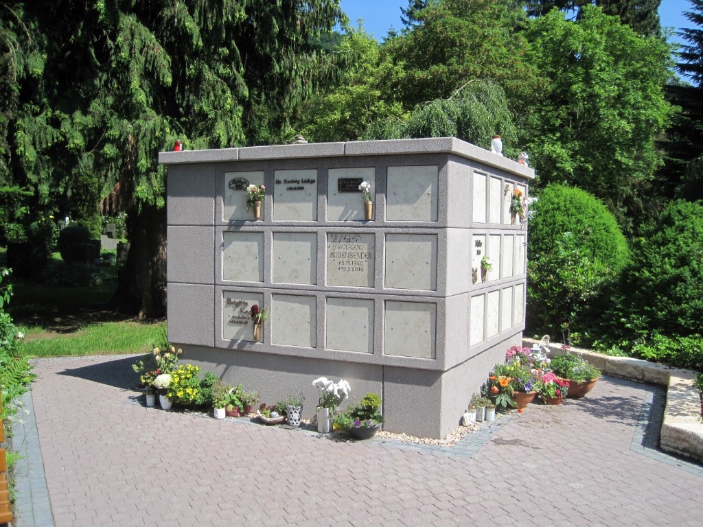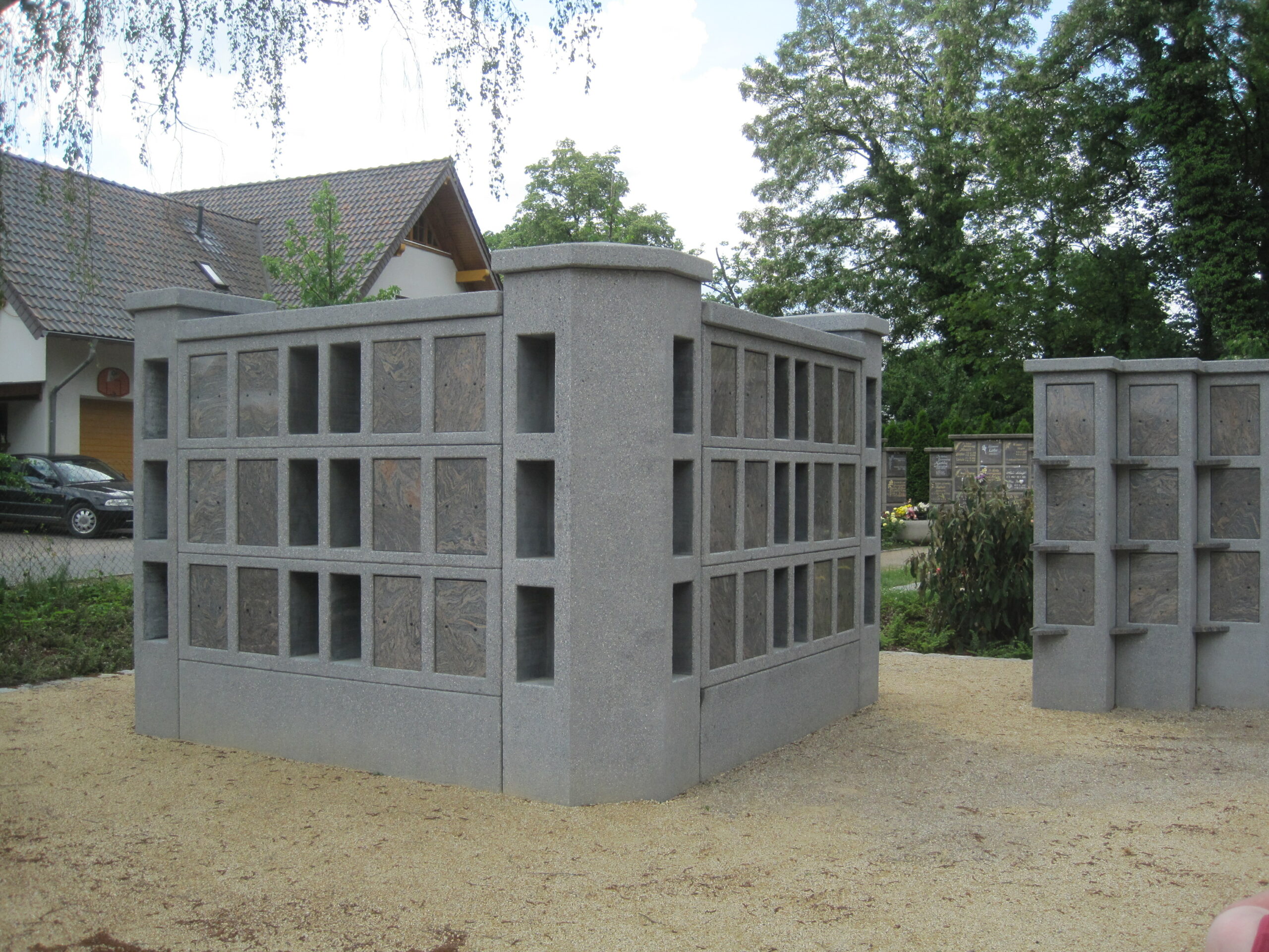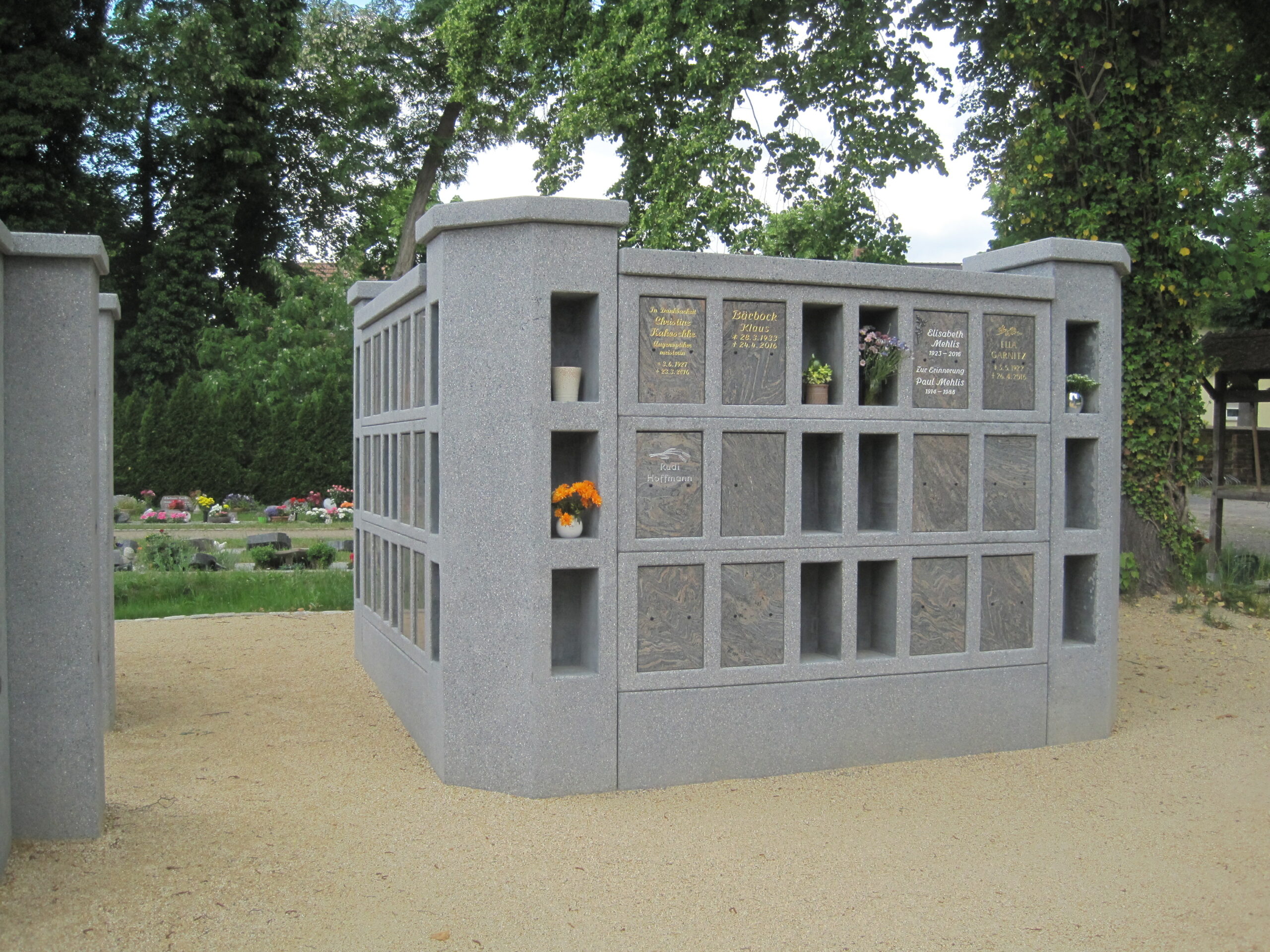 Nicht nur die Urnenwände sondern auch die Eckpfeiler dieses Kolumbariums sind mit Kammern versehen und werden mit Schmuckplatten verschlossen. Die Schmuckplatten sind mit einem nicht sichtbaren Verschluß verriegelt.