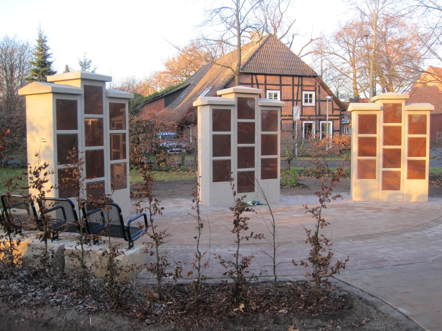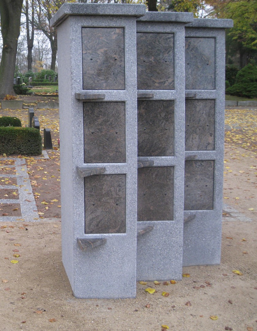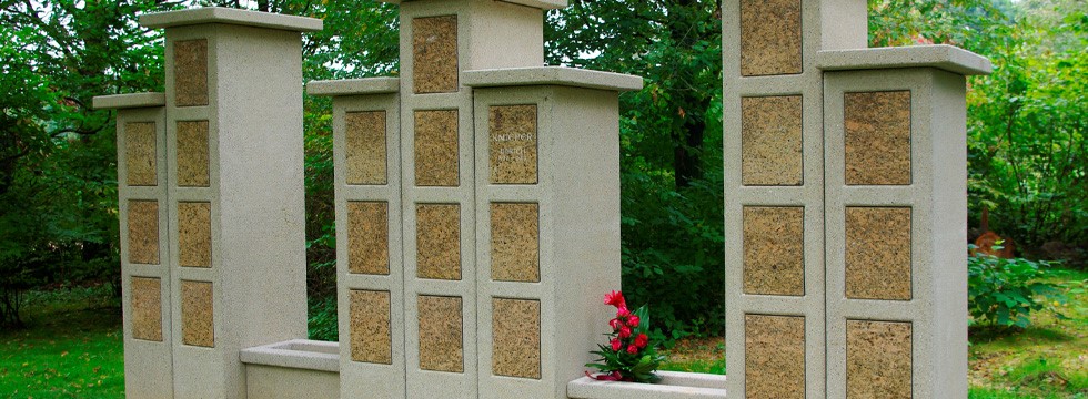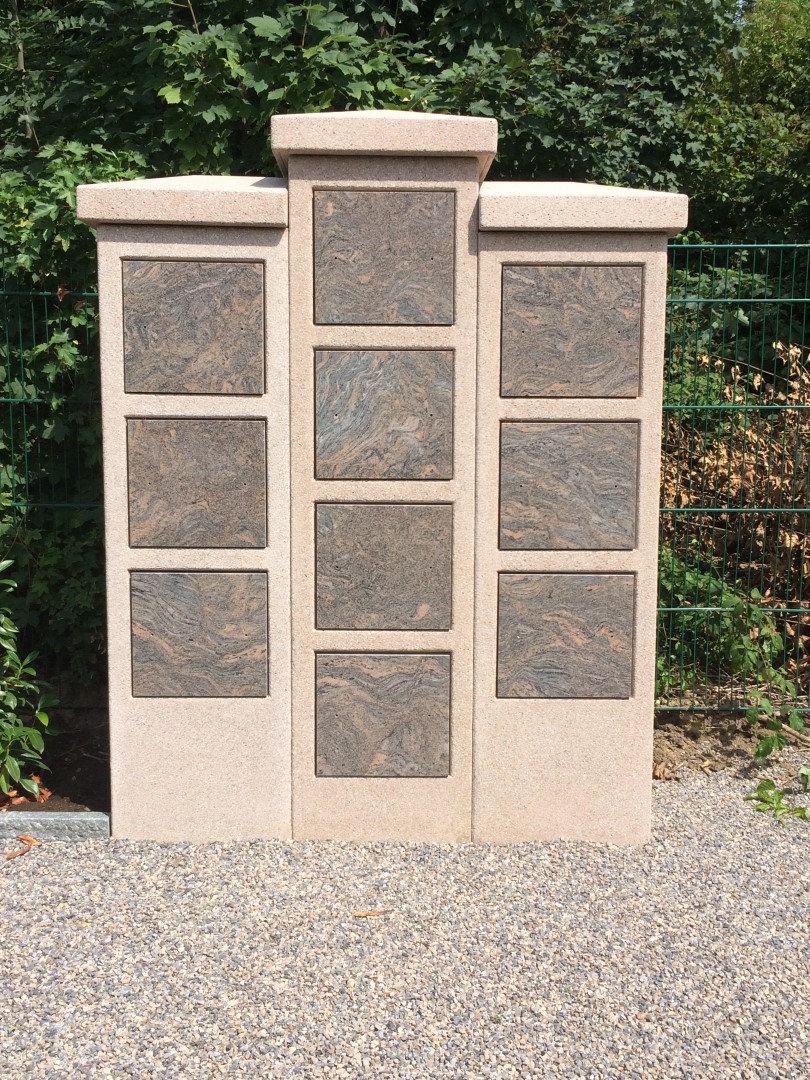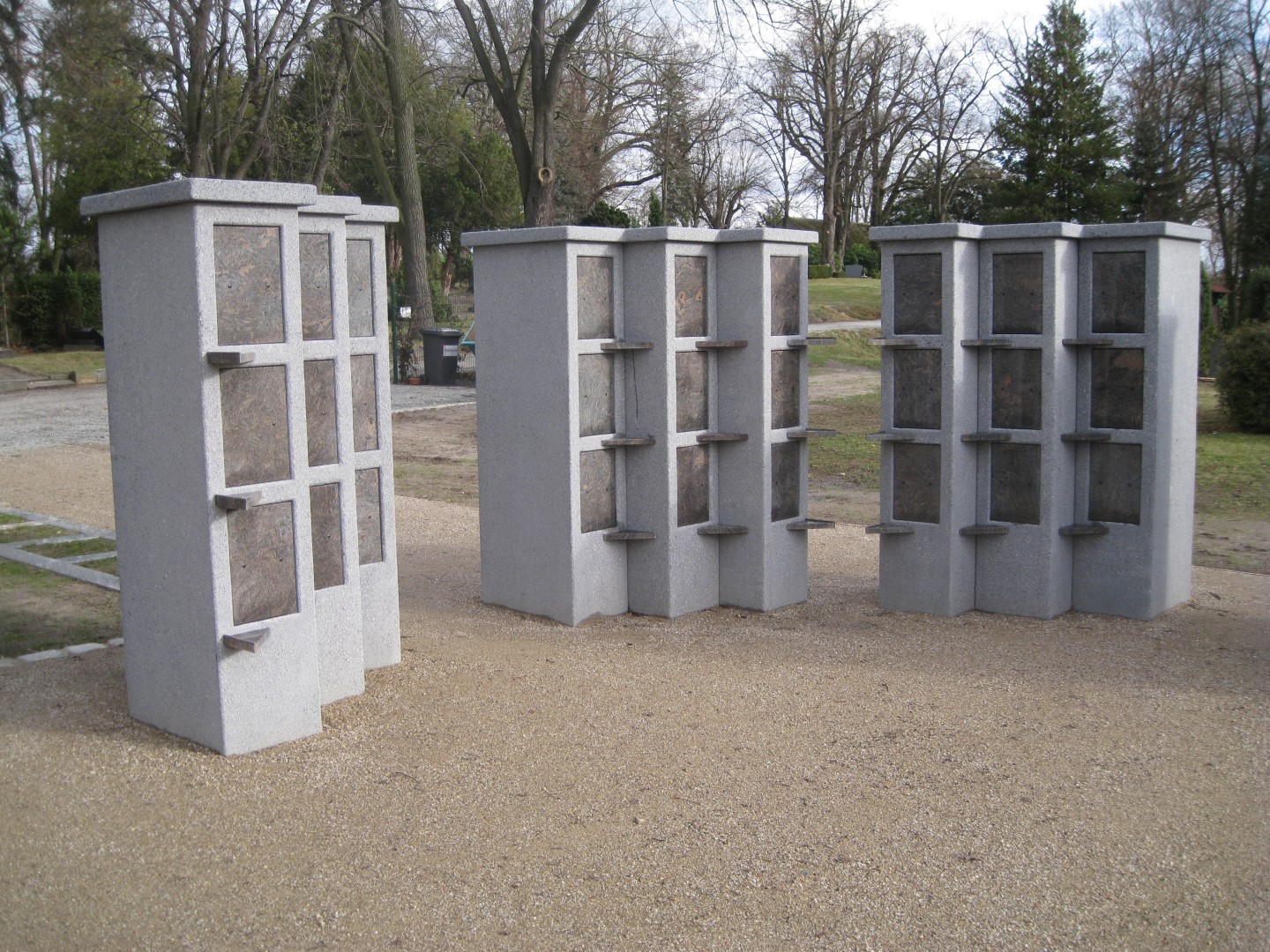 Die Urnenstele Aquila ist vielseitig einsetzbar. Vier oder drei Kammern können in jeder Stele vorgesehen werden. Die Abdeckung mit Walmdach- oder Pultdachplatten ist individuell wählbar. Die Anordnung der Stelen im dreier Verbund hat sich mittlerweile herrauskristalisiert, ist aber ebenso nach Kundenwünschen abzuwandeln.